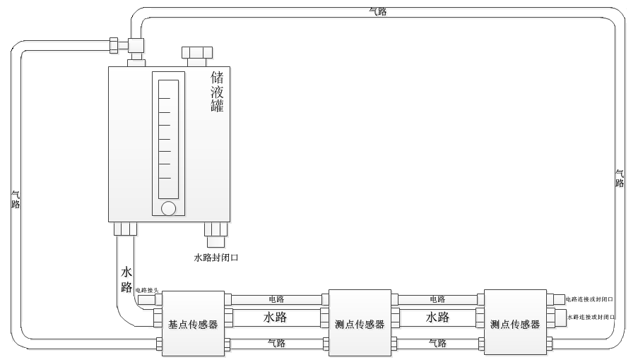 静力水准系统使用的是连通管原理,系统由储液罐、水路、气管、电路、传感单元组成,用于监测道路、路基、建筑、钢结构、水库大坝等结构的不均匀沉降,其系统组成示意图如下: